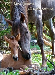 Remember lovely little Adelina and her young momma, Halcyon, from my first post?  They were not rounded up, were spared the long, hot run many miles down into the pens.  What a relief!   A baby horse’s hooves are not yet hard enough to withstand much of anything.