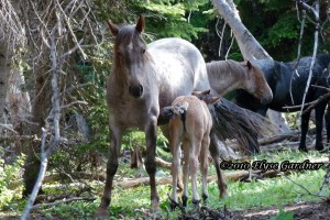 I walked toward a wooded thicket, following the sounds of an occasional snort and swish of a tail as the grazing horses kept their customary summer fly vigil.  I peered through some bushes and literally stopped in my tracks so I didn’t spook the lovely grulla mare and her resting baby.