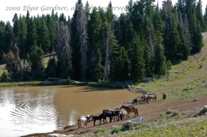 Wild horses in the mountains in family bands took turns drinking and playing in their family groups at the large water hole.  The horses in their natural lives on the mountain in their families were spellbinding, and my new camera and I gobbled up the feast of images in an effort to capture the fullness and quiet beauty of the majesty of the horse families.  Everything about the horses living on the mountains was right.